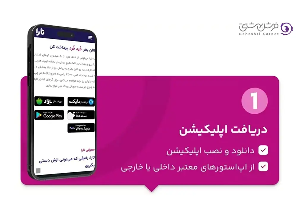از آن جا که رسالت اصلی مجموعه فرش بهشتی، هموار سازی خرید برای مشتری و دریافت اعتبار بدون ضامن و چک می باشد، لذا فرش بهشتی با ایجاد تسهیلاتی مطمئن زمینه ساز ارتقا کیفی و کمی کالای مورد استفاده شده است. فرش بهشتی در جهت بررسی بهتر نیازهای مشتریان خود، امکان خرید بدون پول و واسطه را از طریق اپلیکیشن تارا ارائه نموده است. از دیگر اقدامات فرش بهشتی برای بهبود رفاه مالی و مردمی، خلق راهکارهای نوین برای خرید مطمئن و بی دردسر میباشد. خرید اقساطی از فرش بهشتی با ثبت نام در سامانه تارا امکان پذیر است. خرید فرش از این سامانه مخصوص کارمندان همه سازمان ها بوده و شامل بازنشستگان بدون بهره و نیاز به ضامن می باشد. در ادامه ضوابط و چگونگی دریافت اعتبار از اپلیکیشن تارا شرح داده می شود.