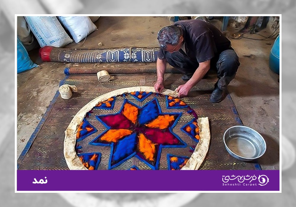 یکی از ابتدایی ترین زیراندازهای سنتی می باشد که با پشم تولید می شود. در نمدمالی عمل بافتن و گره زدن انجام نمی شود؛ بلکه با ایجاد فشار، رطوبت و گرما موجب در هم رفتن الیاف پشمی می شوند. دو خاصیت اصلی پشم یعنی ساختار دندانه ای و فلس مانندی که دارد و نیز کشش و خاصیت ارتجاعی اش موجب در هم تنیدن الیاف پشم و استحکام نمد بدون ایجاد گره می شود.